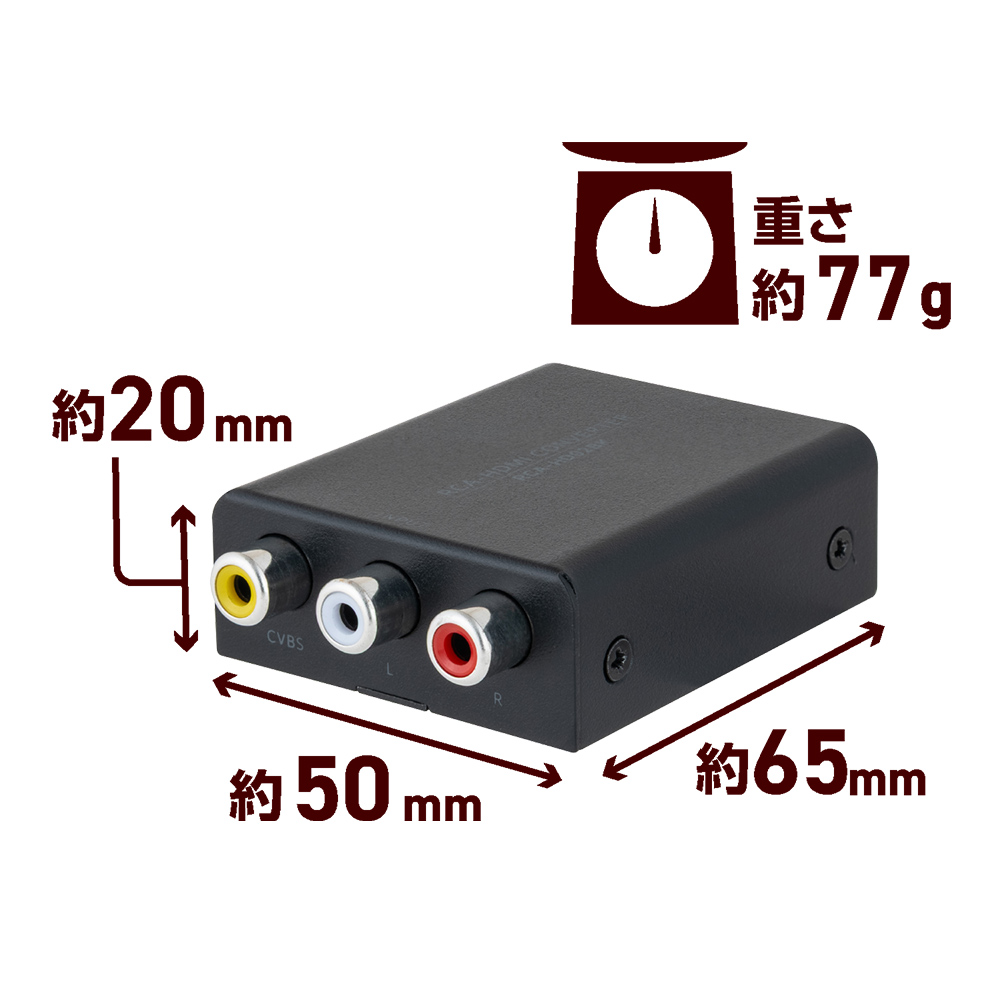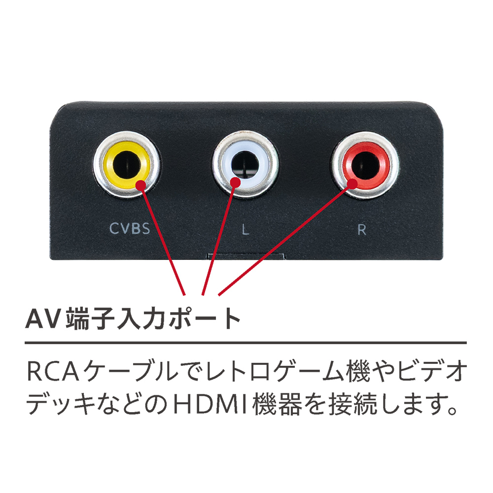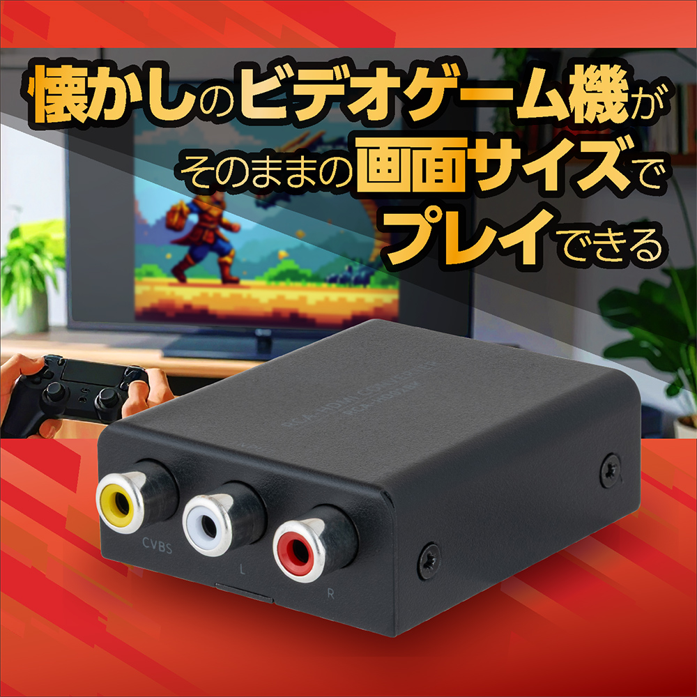 AV入力端子(RCA端子)+HDMI出力機能を搭載した変換器です。 HDMIを搭載したTVやモニターでHDMIを搭載していないレトロゲーム機や ビデオデッキの映像を楽しめます。
