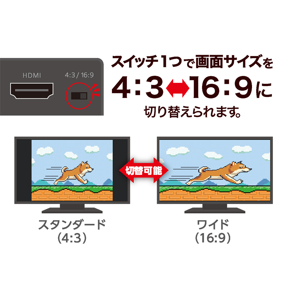 スイッチ1つで画角サイズを元サイズの4:3と ワイドに引き伸ばした16:9に切り替えられます。