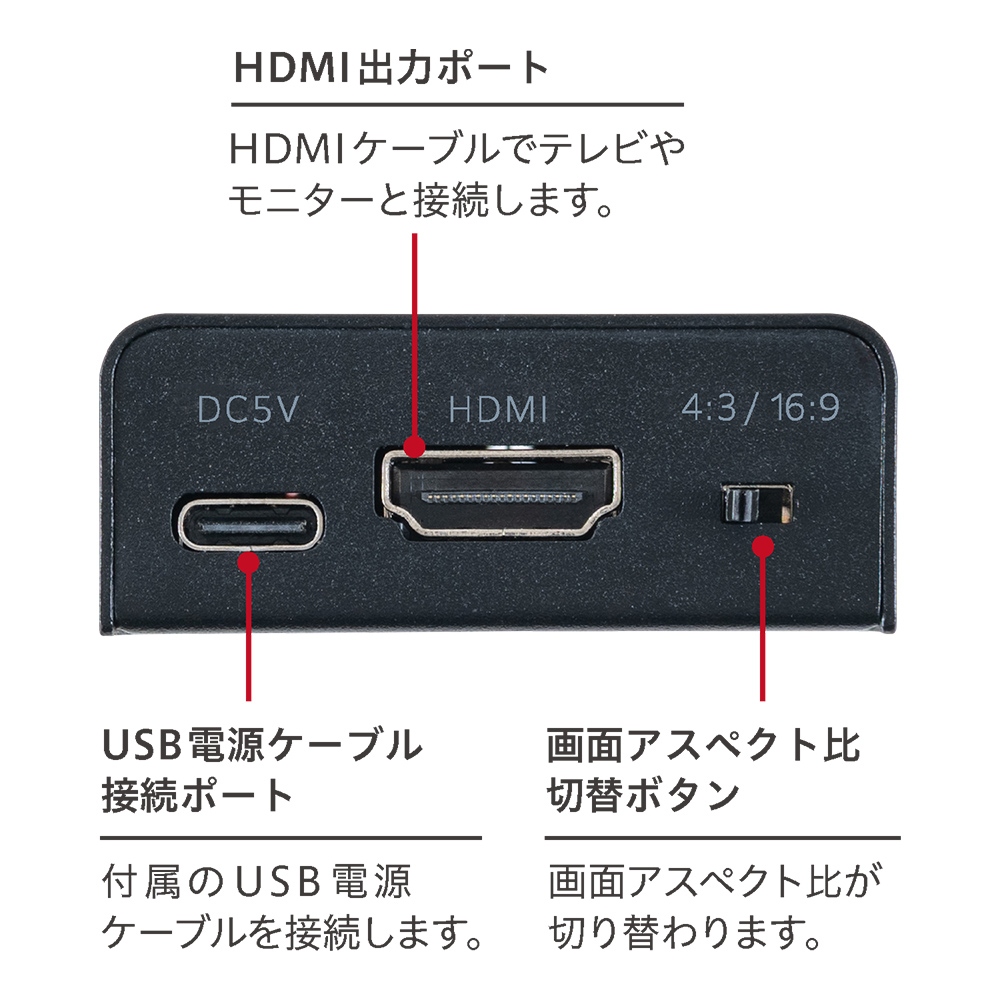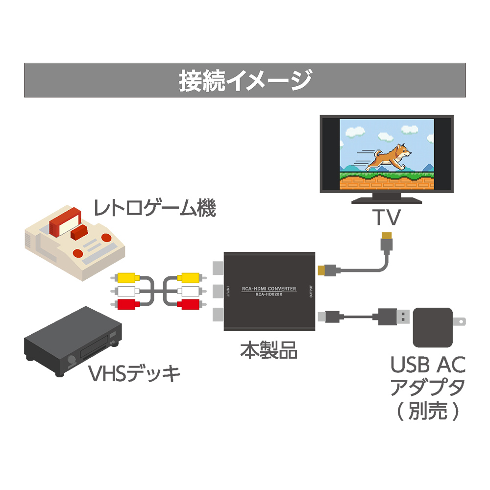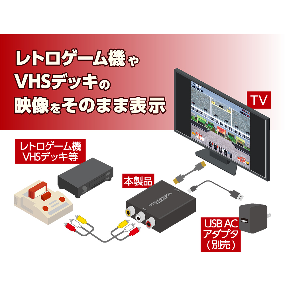 - USB ACアダプタ、RCAケーブル、HDMIケーブルは別売です。