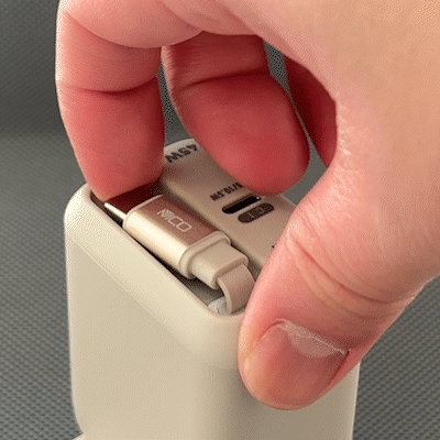 巻取り収納テスト1万回をクリアしたType-Cケーブルを内蔵。コネクタ部分にマグネットが内蔵されているので収納時はピタッと固定して持ち運べます。