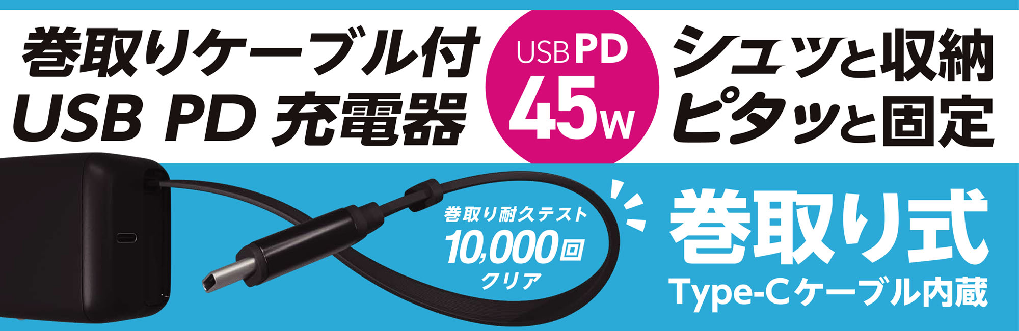 シュッと収納!ピタッと固定!巻取りケーブル付 USB PD 充電器