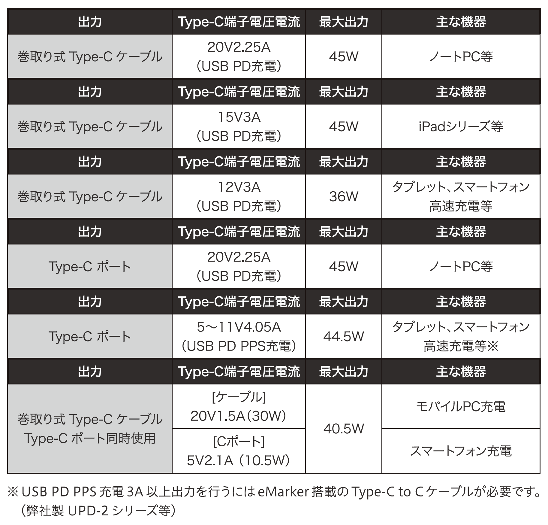 [Type-Cケーブル(最大45W)] 5V3A,9V3A,12V3A,15V3A,20V2.25A PPS 5~11V3.0A [Type-Cポート(最大45W)] 5V3A,9V3A,12V3A,15V3A,20V2.25A PPS 5~11V4.05A
