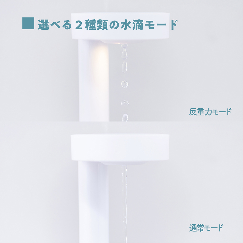 ストロボ効果により水滴が重力に逆らって “浮かび上がる”ように見える[反重力モード]と水が上から下に落ちる[通常モード]の2種類のモードを選択できます。