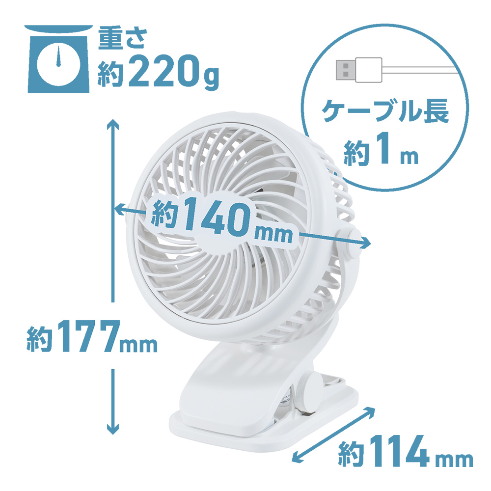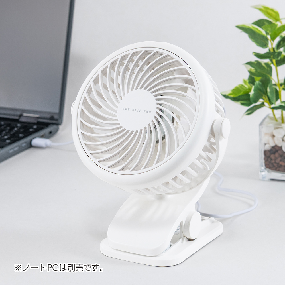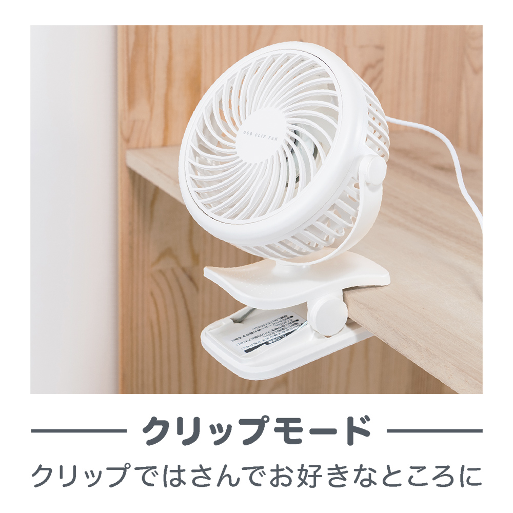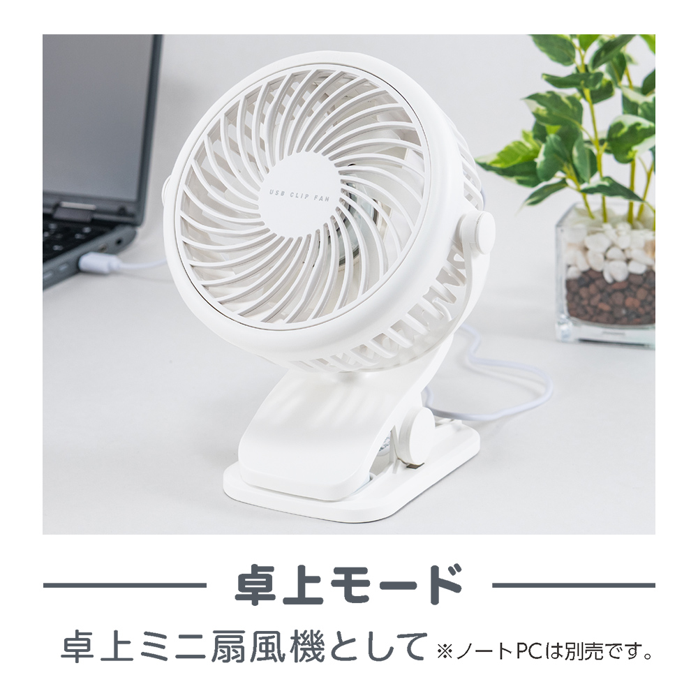 卓上型・クリップ型の2wayで使えるUSB扇風機です。 底面がフラットになっているので、コンパクトサイズの卓上型扇風機としてお使いいただけます。