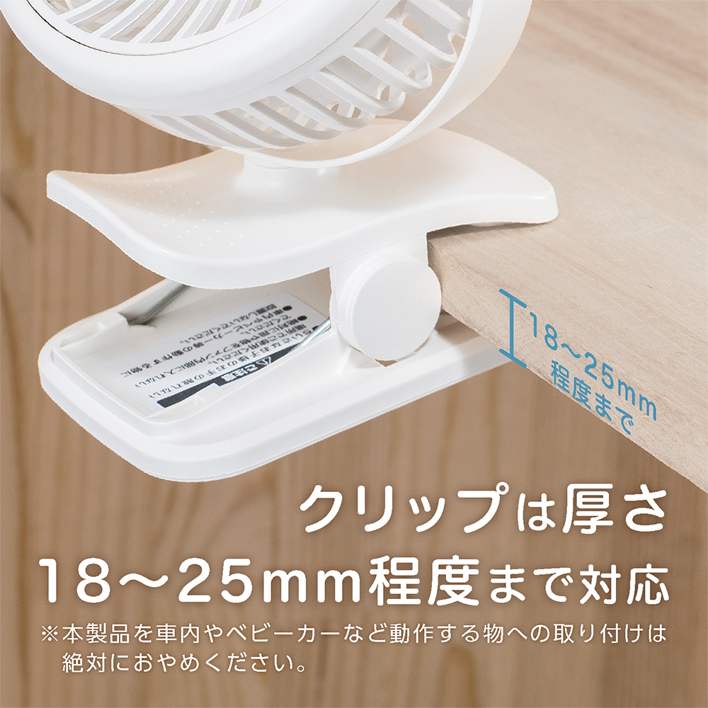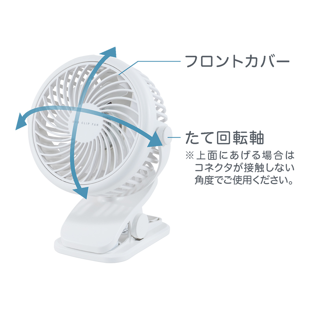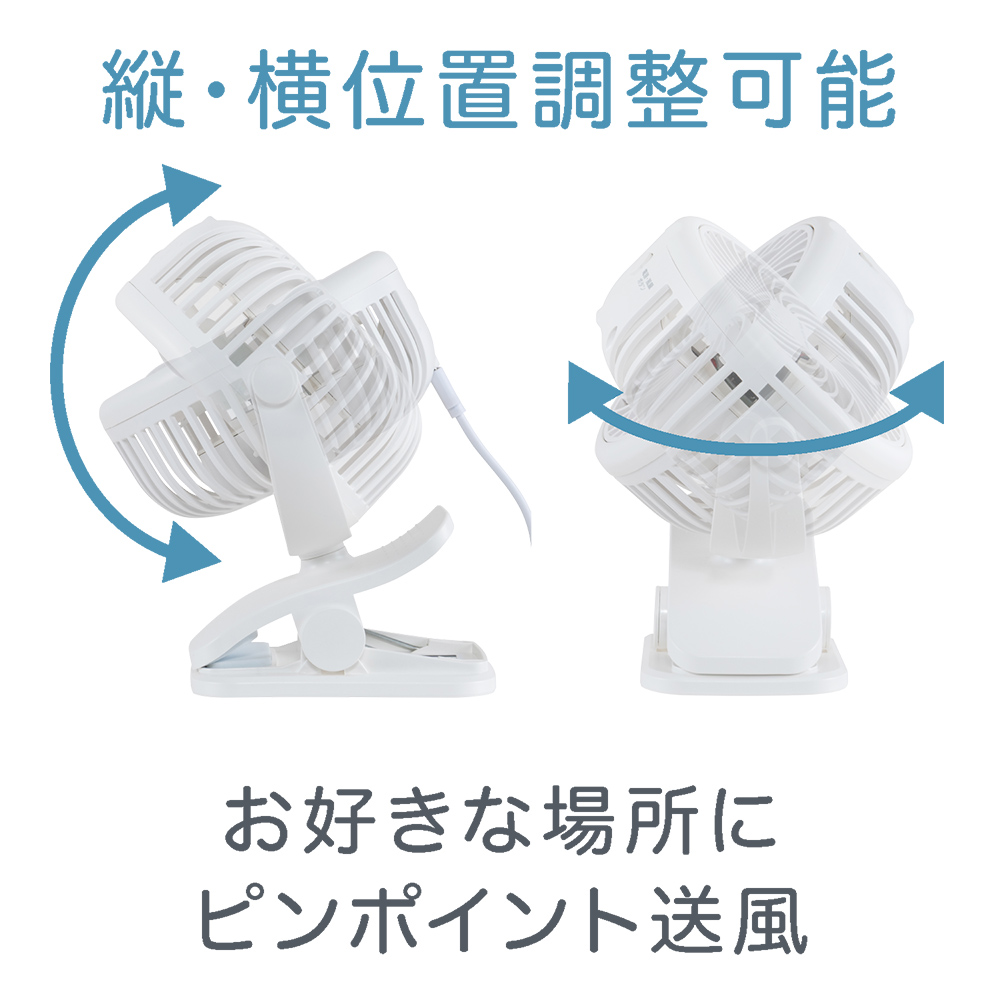 手動で縦・横回転が可能。設置場所や設置方法に応じて調整ができます。 クリップ型と回転機能の組み合わせでお好きなところに ピンポイントで送風できます。