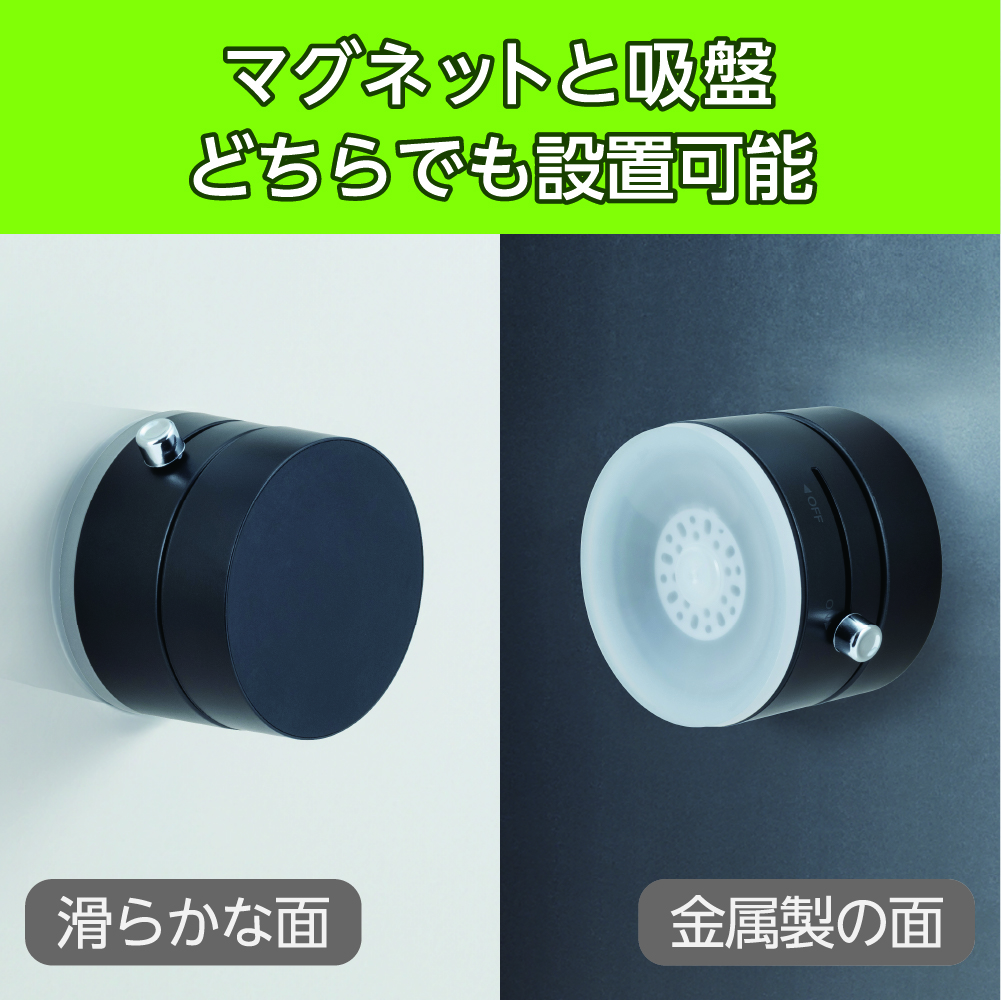 滑らかな面には吸盤、金属製の壁にはマグネットで設置できます。